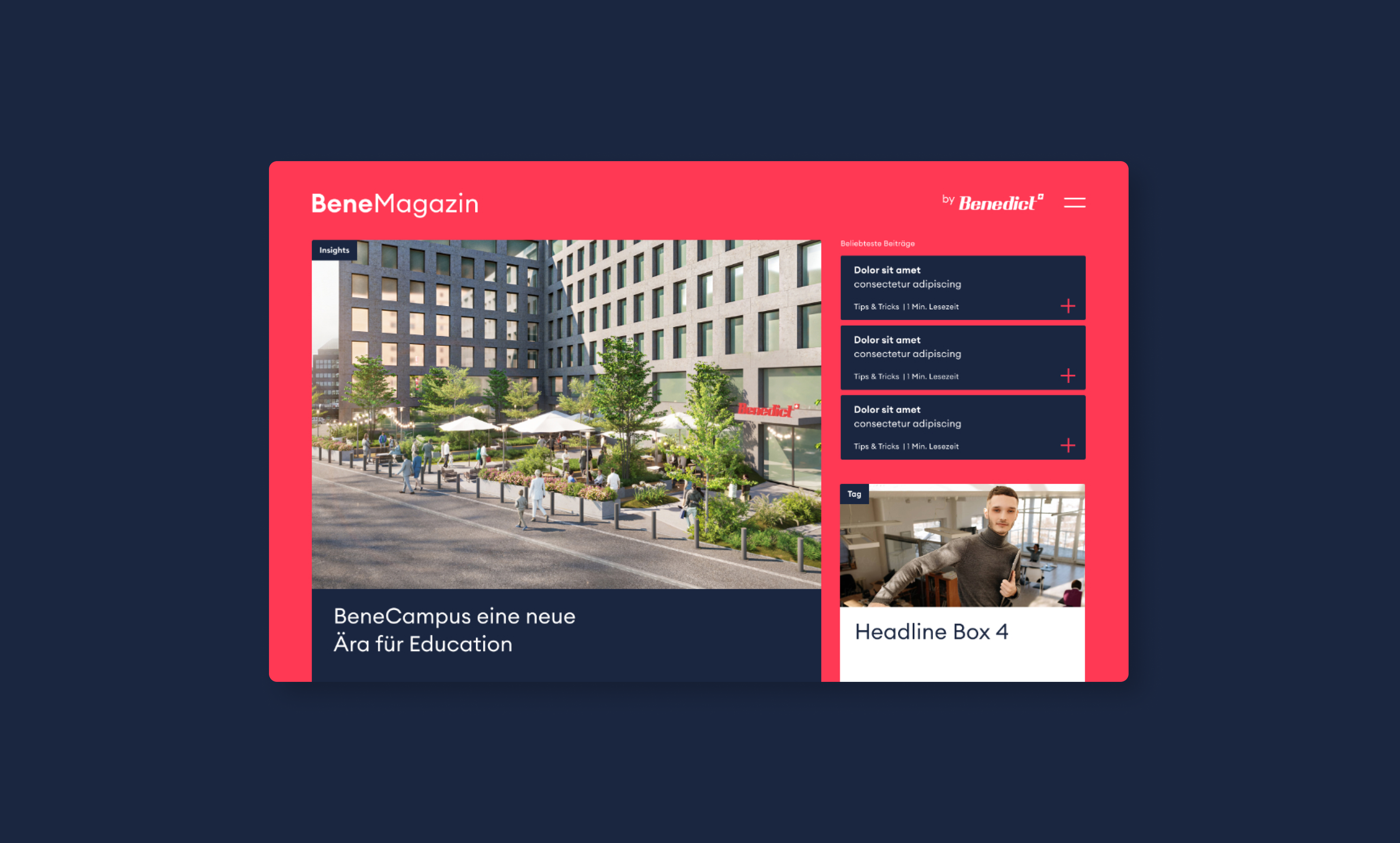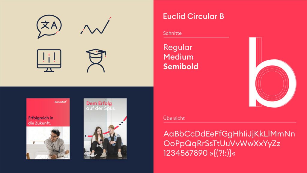 Im Zentrum stand die Schärfung der Marke Benedict als Bildungsanbieterin, die nicht exklusiv sein will, sondern zugänglich, optimistisch und professionell. distylerie entwickelte dafür ein neues, visuell eigenständiges Brand Design: mit klarem Logo, warmen Farbräumen, der geometrischen Schrift Euclid Circular B und einer Bildwelt, in der Menschen und Lebensrealität im Vordergrund stehen.